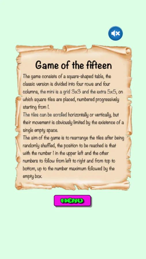 The aim of the game is to rearrange the tiles after being randomly shuffled, the position to be reached is that with the number 1 in the upper left and the other numbers to follow from left to right and from top to bottom, up to the number maximum followed by the empty box.