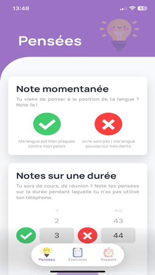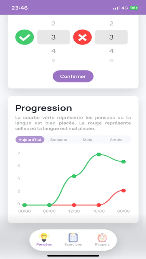 - A chaque fois que vous pensez à votre langue, répertoriez sa position sur l'application qui se charge de générer des statistiques. Ainsi, vous voyez votre évolution sur différentes durées. Vous avez aussi accès aux moments de la journée où vous avez le plus haut ou le plus bas taux de pensées.