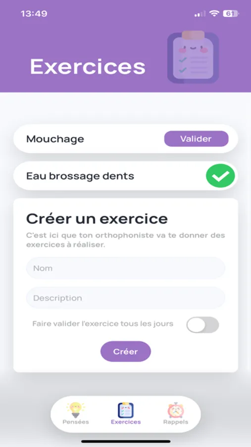 - Notez les exercices quotidiens donnés par votre orthophoniste, afin de pouvoir les valider chaque jour. Une pastille rouge s'affiche sur l'icône de la page Exercices tant que vous ne les avez pas validés.