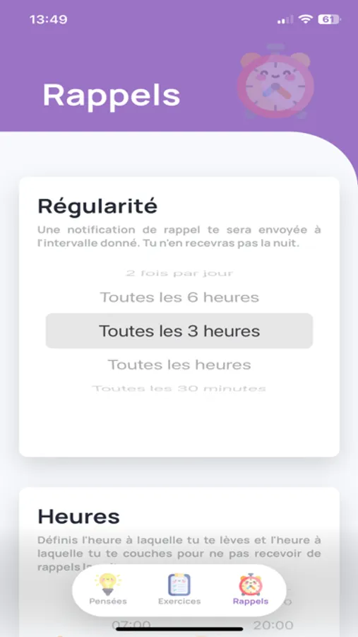 - Paramétrez des rappels allant de une fois par jour à une fois toutes les 15 minutes.