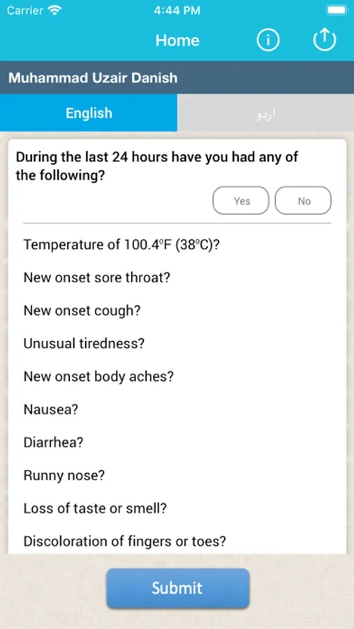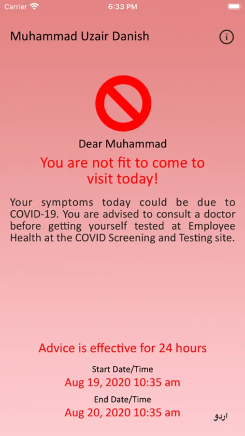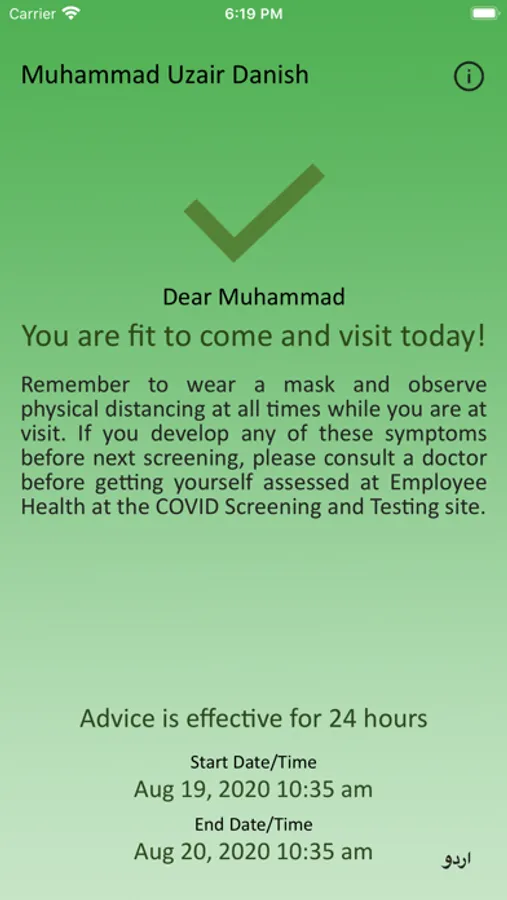 Sehat Check is a screening app to control COVID-19 spread. This is a patient safety requirement and this app is developed to control the spread of COVID-19 amongst the patients coming in the Aga Khan University Hospitals, as well as the healthcare providers taking care of them.