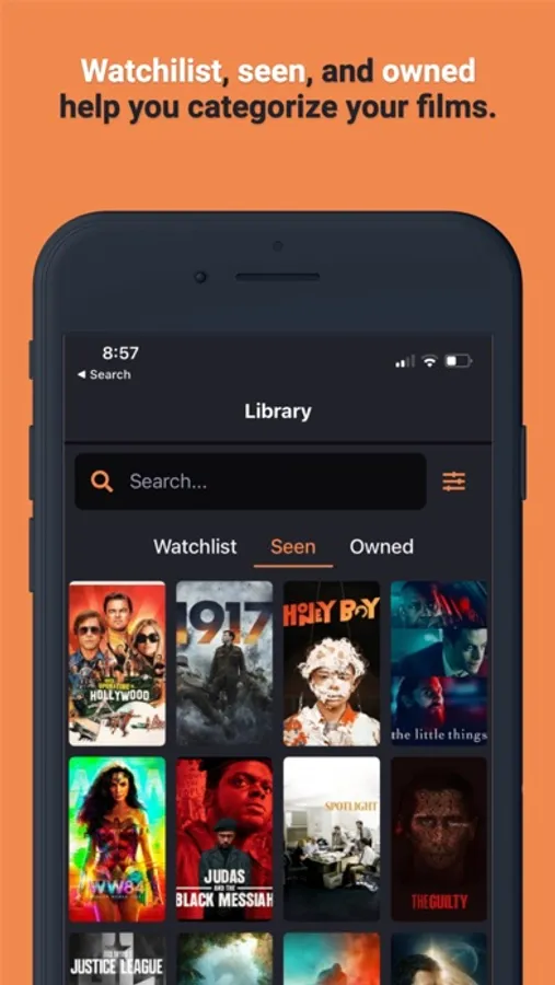 With details including movie earning breakdowns, season details, summary and related films, the details page gives you everything you need to know in a glance about a film you are interested in. After you have decided a film is right for you, you can easily add it to your watchlist with the tap of a button. After you have decided to give the film a watch, move it over to your seen list so you do not come back in a year wondering if you have seen that particularly familiar looking film. If you want to stay on top of your growing collection of movies, add it to your owned list.