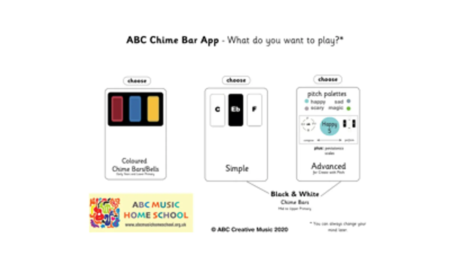 An app offering coloured pitched bells and black and white chime bars designed for use with a wide range of creative activities on ABC Music Home School at www.abcmusichomeschool.org.uk.