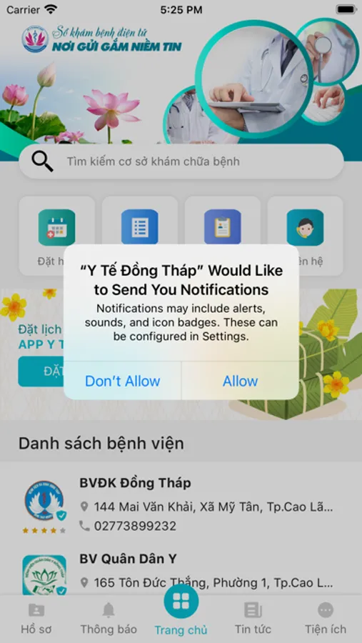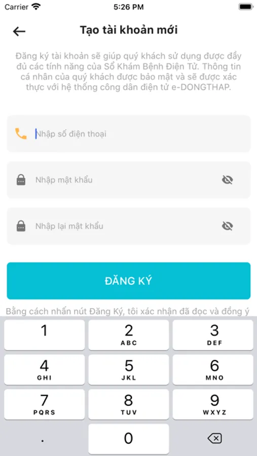 Ứng dụng cho phép sử dụng tài khoản e-dongthap để đăng nhập trực tiếp và khởi tạo tài khoản y tế điện tử.