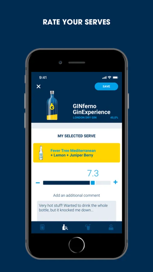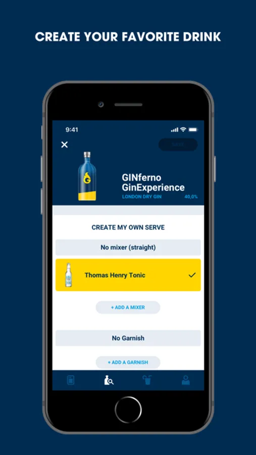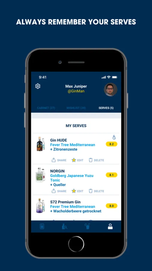Have a new recipe which isn't in the app yet? Create your own recipe based on over 12,000 gins, 1,200 mixers and 220 garnishes. Rate it, comment on it, and keep it for yourself or share it with friends.
