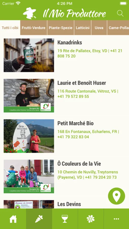 Priva di pubblicità e facile da usare, l'App mette in contatto consumatori e produttori. Non vende nulla, ma permette di scoprire o cercare i prodotti locali e di ottenere informazioni su dove acquistarli. Ogni scheda di profilo elenca i prodotti, gli orari di apertura, i contatti e alcune foto o video. I profili sono filtrati per categoria di prodotto e ordinati per distanza, dal più vicino al più lontano dalla vostra posizione.