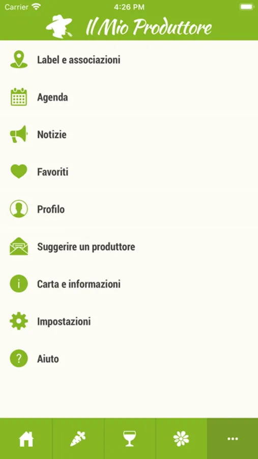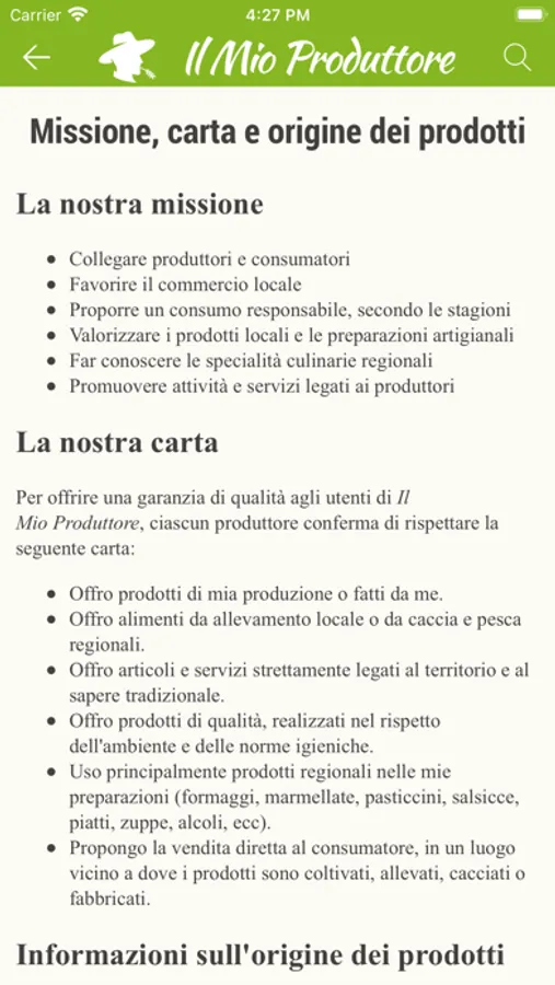 - Agenda: eventi legati al mondo dei produttori e degli artigiani. Ogni produttore elencato nell'app può proporre i propri eventi.