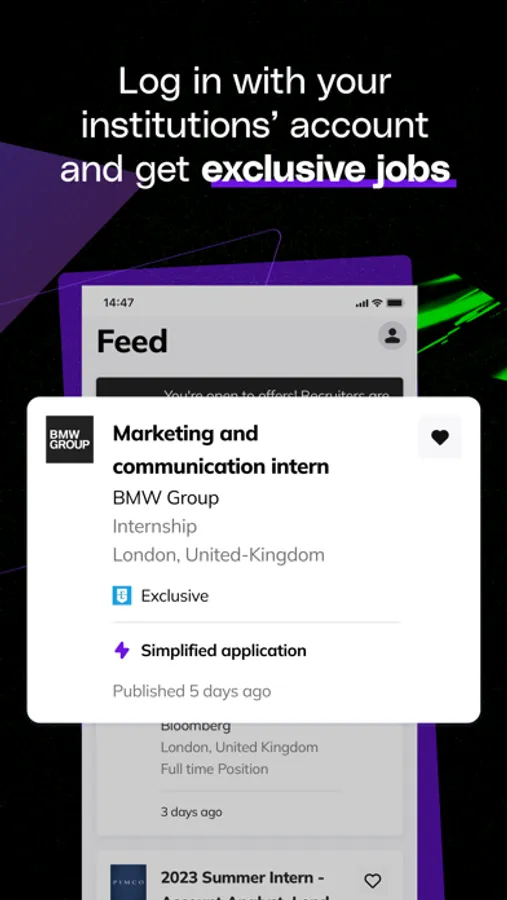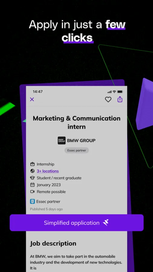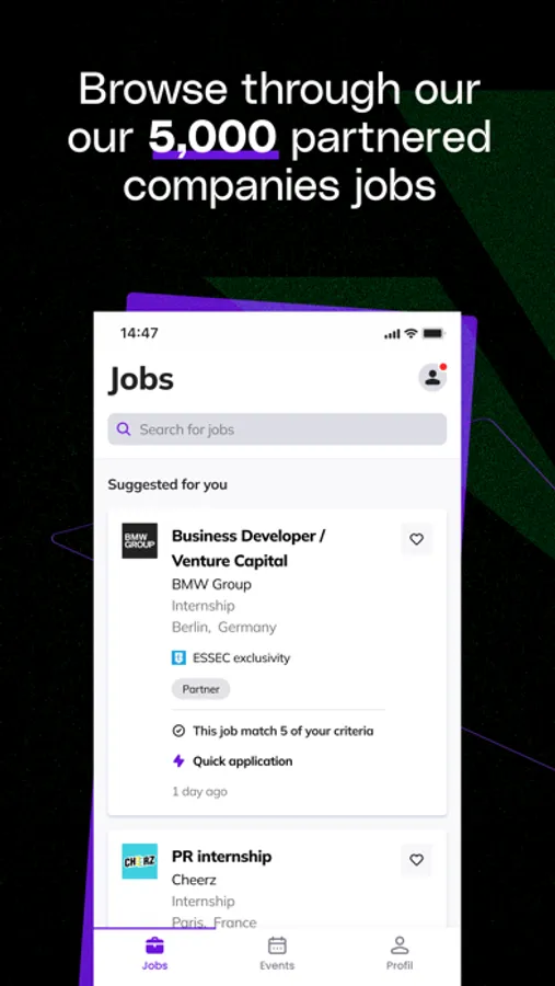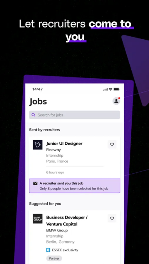 Find your dream job on the JobTeaser app dedicated to students, and let recruiters come to you! With our 4,000+ partnered recruiters (among which BWN, Henkel, Zalando, Amazon, Deutsche Bahn to name a few…) it doesn’t matter if you are looking for an internship during your studies or a full time job right after you graduate: JobTeaser has your back.