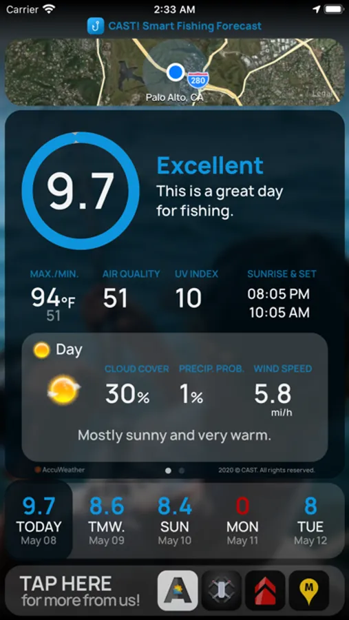 This app combines solunar & weather information to measure the day's peak conditions for fishing.