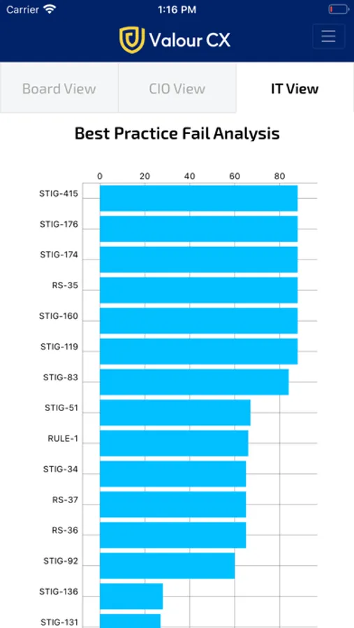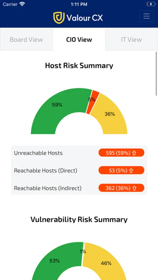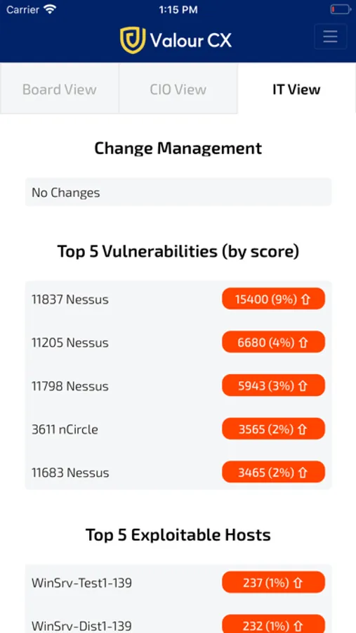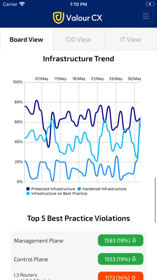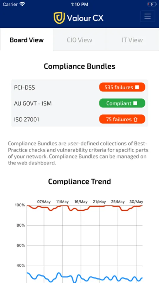 Valour CX’s Cybersecurity Compliance Dashboard simplifies the achievement of compliance by putting key compliance and technology risk metrics into focus. The dashboard offers a consolidated view of compliance, best practice and vulnerability data for the organisation's network infrastructure with admin-customisable tabs that highlight the metrics relevant to the stakeholder.