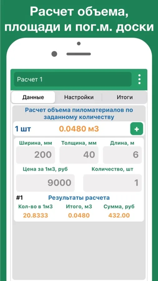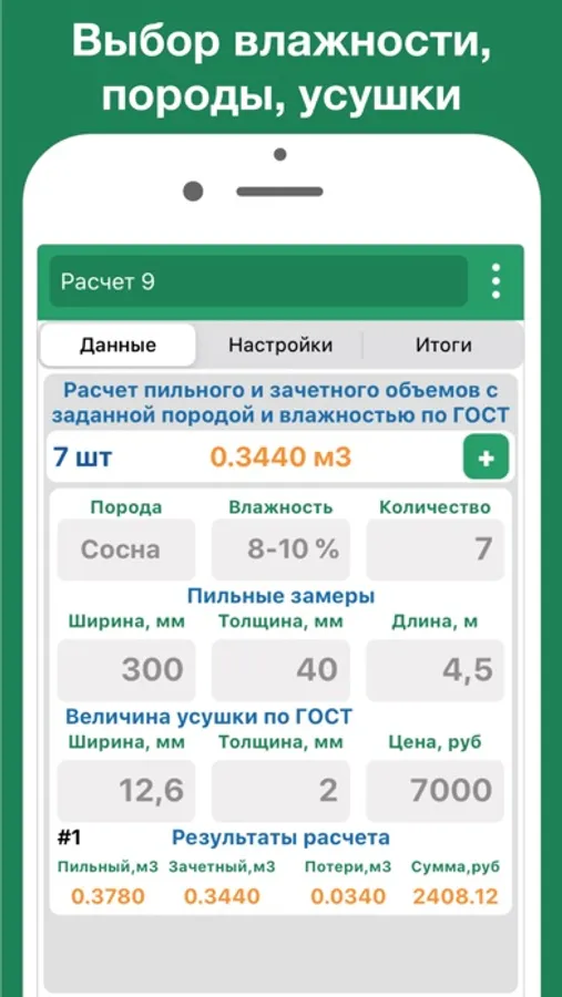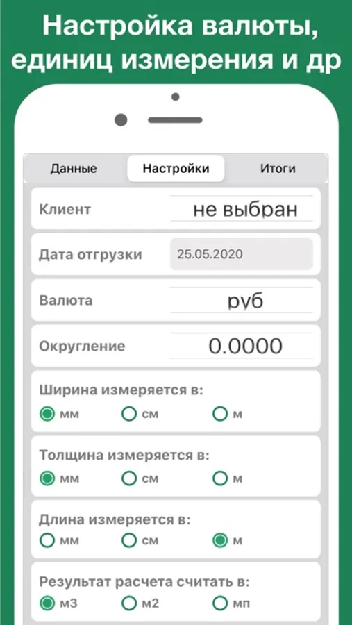 ► удобные настройки по умолчанию - можно настроить цену, единицы измерения, валюту, округление, ширину, толщину, длину, породу, влажность, допуски на усушку, которые будут добавляться по умолчанию для всех новых записей и расчетов