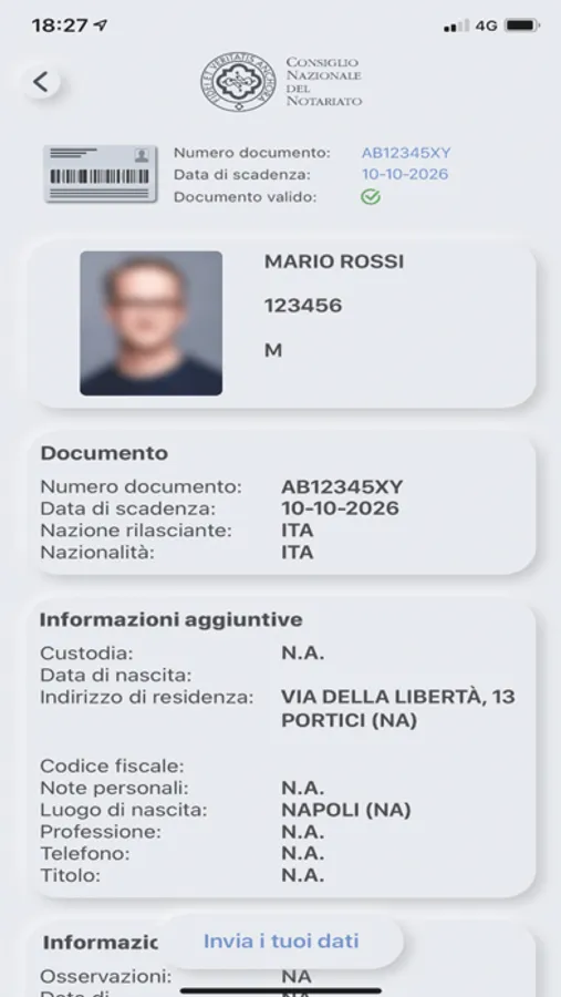 • Verificare la correttezza dei dati acquisiti tramite la scansione e cliccare sul pulsante “Invia i tuoi dati”; inserire il codice “ID Richiesta” fornito dal notaio.