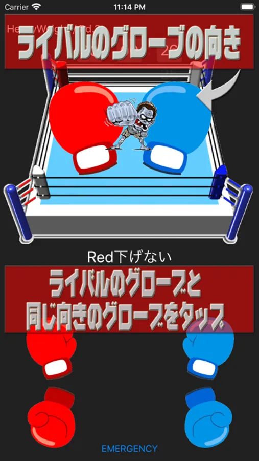試合画面の下に「EMERGENCY」ボタンがあります。