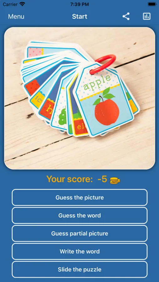 You can see statistics by choosing the menu item in the Main Menu. Information includes the overall score, accuracy, count of correct and incorrect answers.