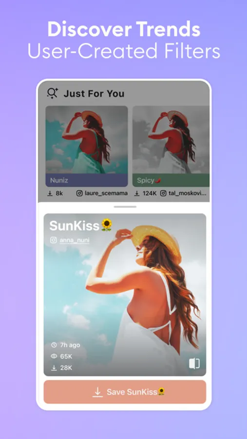 Find other filter fanatics to influence with your aesthetic or exchange filters with talented creators. The Discover feature makes it easy to gain social recognition while scouring the network for continuous inspiration. The more your filters are downloaded, the more exposure you get! Think of it as clout for creativity.