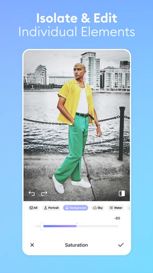 Isolate & edit different parts of your photo or video with this editing feature. Each element (people, background, sky, etc…) can be separately adjusted to look exactly as you imagined.