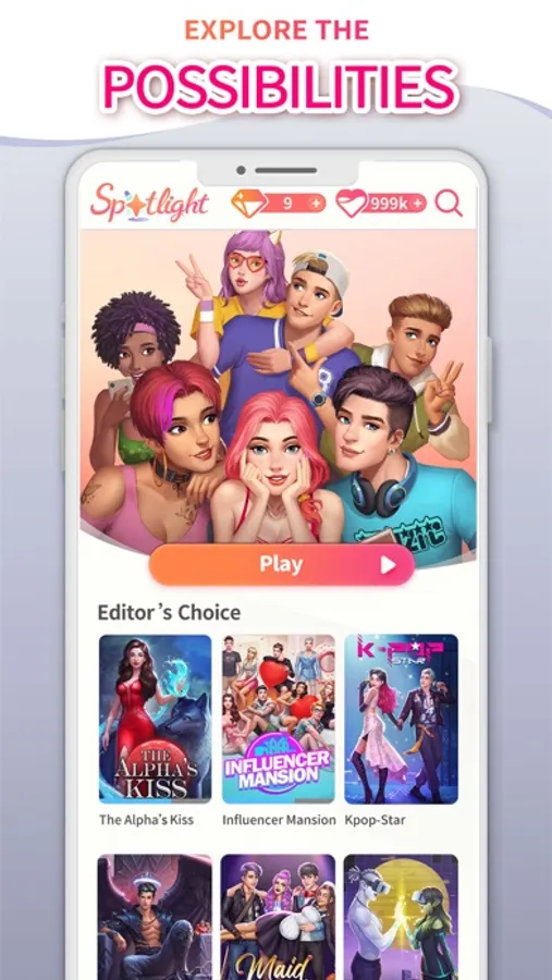 Spotlight is the latest HIT that brings stories to life through animation and unique storytelling gameplay. You can be an influencer with millions of fans, an Alpha king with magical powers, a vampire with a dark secret, or a queen with a grand agenda! Each character is equipped with unique personalities, stories, and abilities. Follow your heart, build friendships... or not, the decision is YOURS! Every decision lies in the palm of your hands. Choose how you interact with other characters, take control of your story, and be whoever you want!!