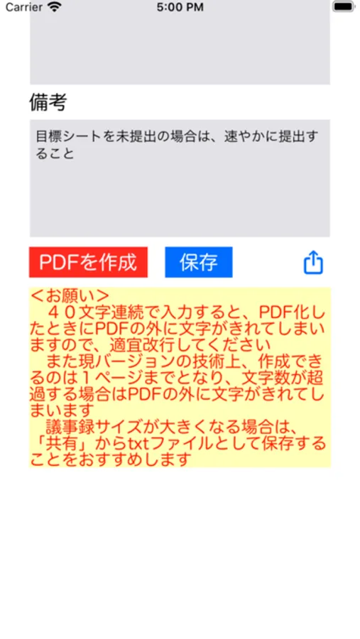 ・技術上、作成できるのは1ページまでとなり、文字数が超過する場合はPDFの外に文字が切れてしまいます。