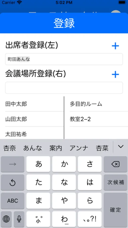 [2] 議事録追加画面で登録しておいた(下記)会議場所や出席者を「登録から選ぶ」を押してリストから選択すると自動で入力欄に入力されます。