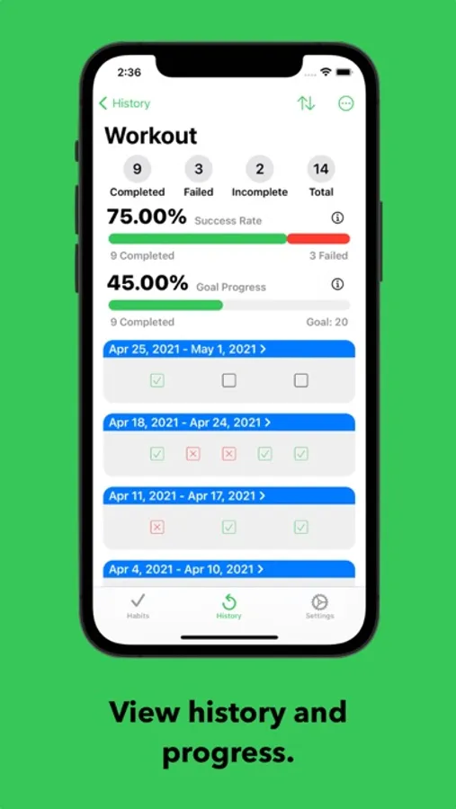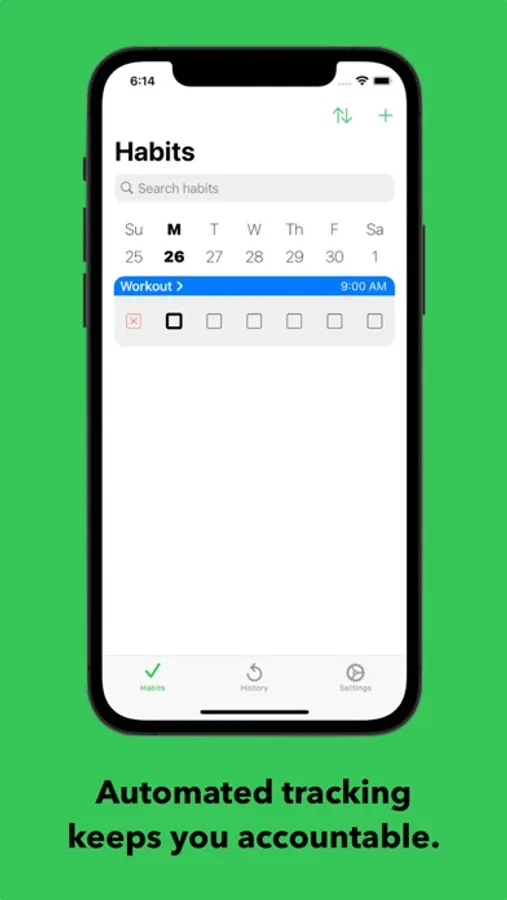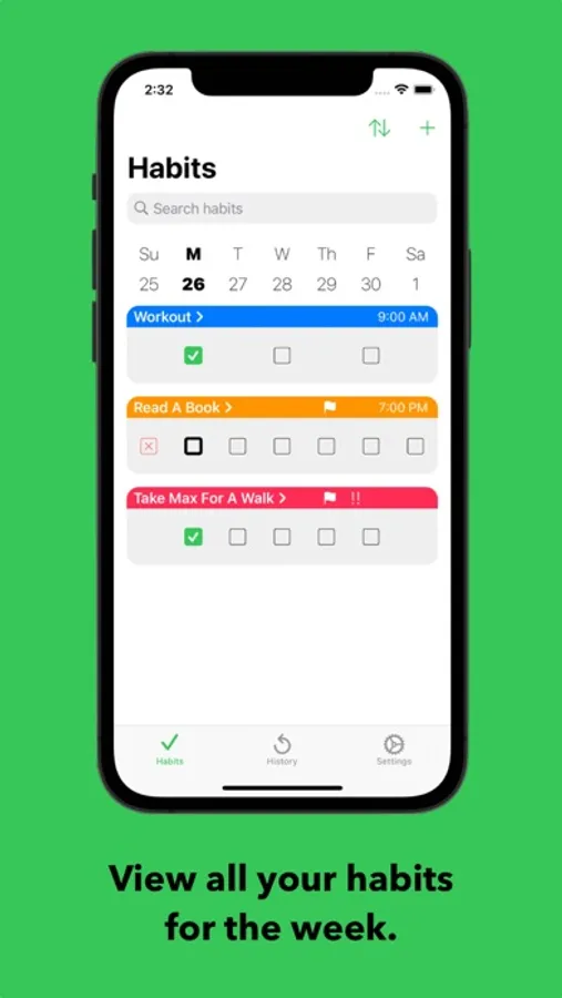 - Easily view your daily habits on a weekly basis and know what does (and does not) need to be completed for the current day.
