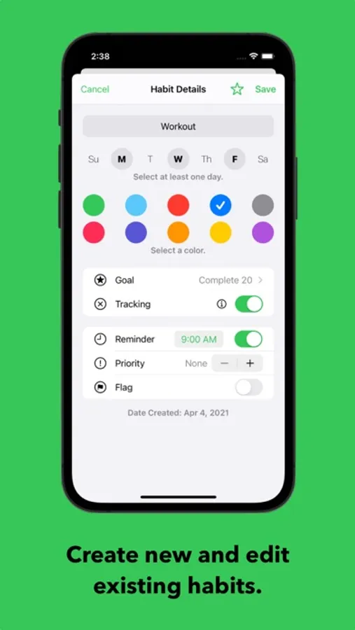 - Create and edit any habit with a title, color, days of the week to be completed, reminder time, etc.