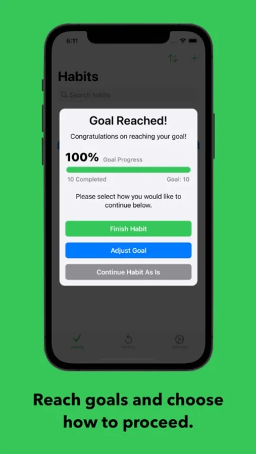 - Set a goal to reach for any habit, with the option of "Finishing" that habit when your goal is reached.