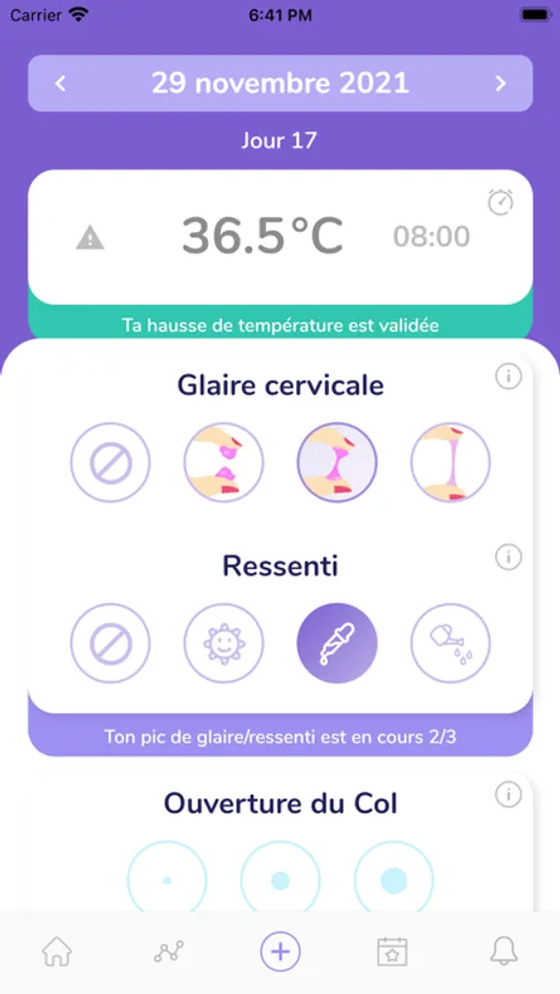 • Suis ta période pré-ovulatoire (infertile présumée), ovulatoire (fertile) et post-ovulatoire (infertile)