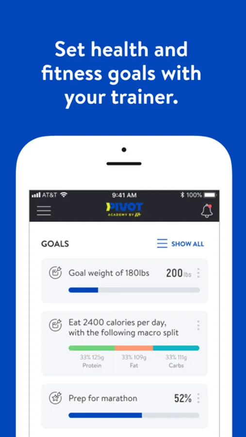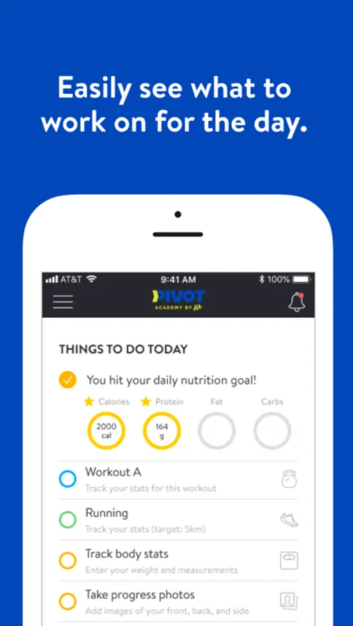 With the PIVOT Academy App, we bring community, accountability, empowerment + engagement to you. You can engage in personal training, health coaching, small and large group coaching, and challenges. Start tracking your activities, nutrition and healthy habits, measuring results, and achieving your fitness goals, all with the help of your coach.