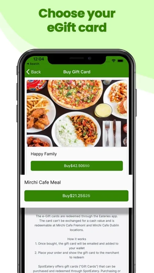 Browse neighborhood merchants. Order your eGift card with a few taps and pay your order with a gift card saved in the app's wallet. Paying with SpotEatery eGift card is the smartest way to get tons of savings and to donate to your favorite local charity. It is a perfect gift to send your friends and family with a few clicks.