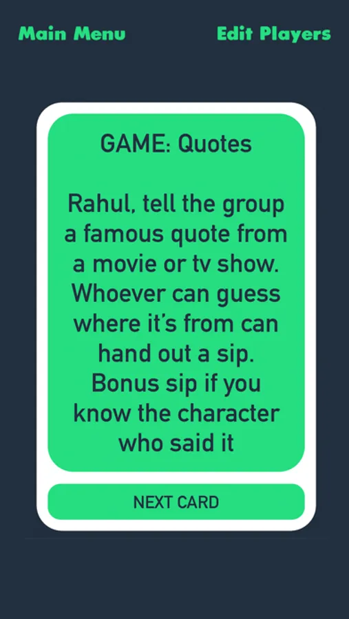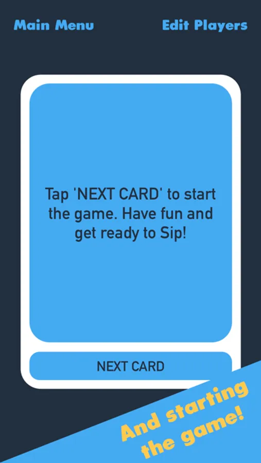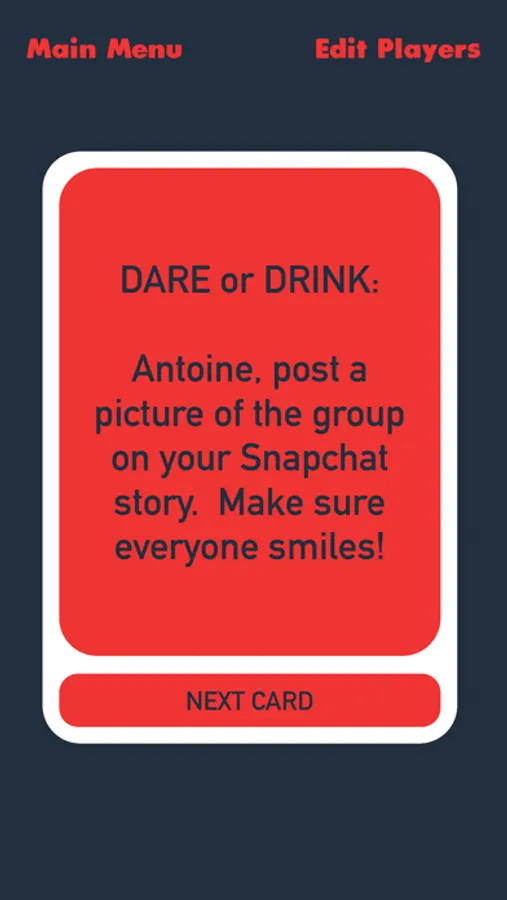 To begin playing, tap New Game to "shuffle" the deck and let the fun begin. Players will be randomly selected to participate in dares, games, trivia, and so much more.