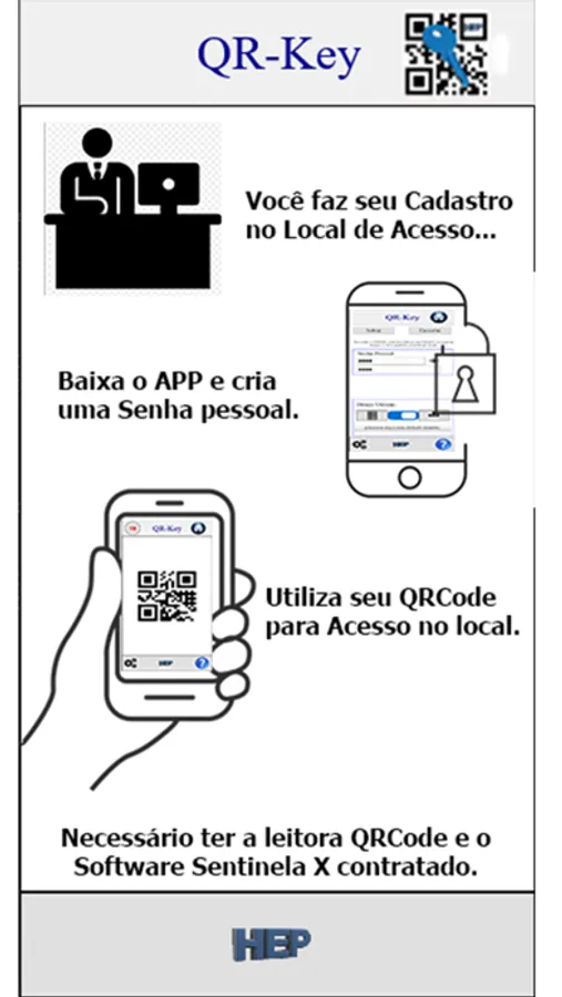 APP desenvolvido para que após cadastramento em locais determinados, a pessoa através de uma leitora QRCode instalada e a Contratação do Software de Controle de Acesso Sentinela X, possa ter acesso com seu QRCode. O QRCode só pode ser visualizado, após digitação de senha pessoal em seu próprio dispositivo criado, impossibilitando a visualização do QRCode por pessoas não autorizadas. saiba mais em www.hep.com.br.
