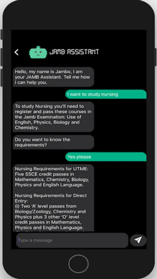JAMB Assistant is a special guide bot for JAMB, the Joint Admissions and Matriculation Board. This application is build to help you or yours, achieve their dreams, for we can only make choices we know exist.