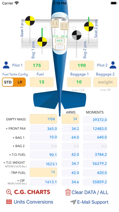 Cessna 152 Mass & Balance calculator with easy and interactive weights adding, Arm selecting and real time Chart plotting.