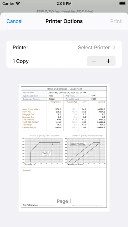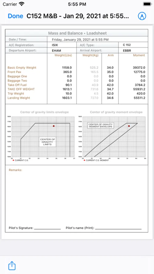Create your PDF file with your loadsheet in a professional looking sheet, save it, print it, share it or e-mail it! Includes regulatory data such as A/C registration, departure aerodrome, arrival aerodrome, time and date.