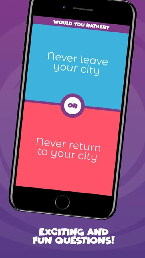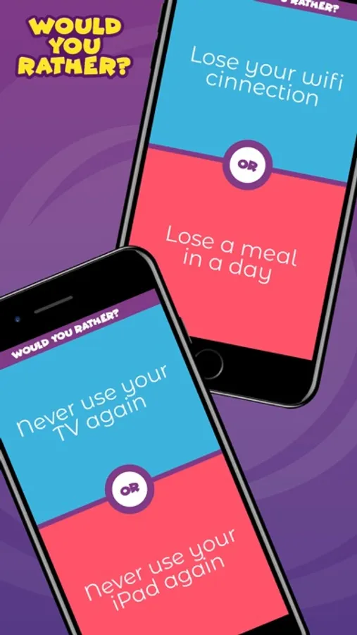 Would You Rather consist in a game where you get presented with a question 'Would You Rather..' and then two buttons will appear on the screen, a red button and a blue button. Every button will contain a word or a phrase and then you need to decide which one do you prefer. This simple game can get very challenging as the options not are always pleasant or easy to do. That's the beautiful part of this game, makes struggle your mind so you can think what would you do under that situation.