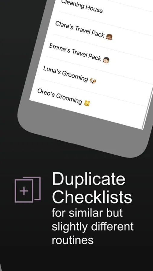 + Duplicate checklists easily: make similar checklists for each of your children, pets etc.