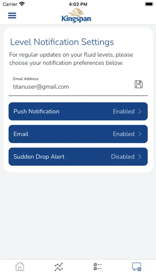 • Set up notifications so you can get notified of the level in your tank or if any irregular behaviour has been identified
