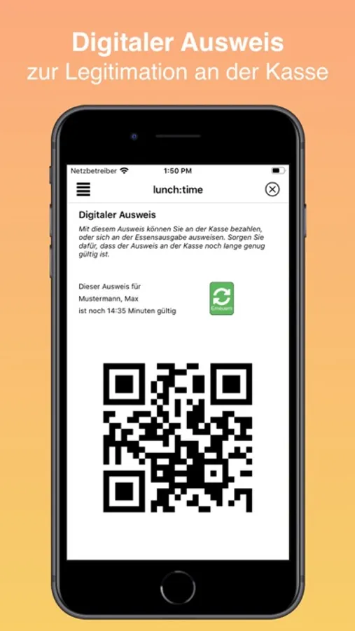 Falls Sie Ihren Ausweis für das Mittagessen nicht eingesteckt haben, kein Problem, die App stellt Ihnen für die Abholung einfach einen digitalen Ausweis in Form eines QR-Codes zur Verfügung.