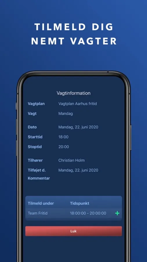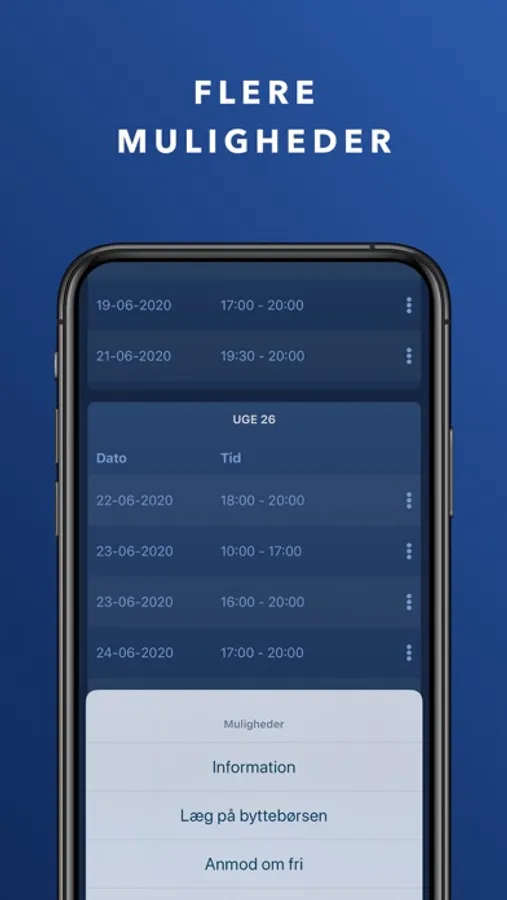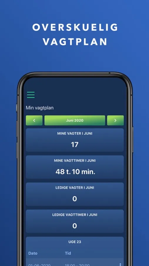 I din vagtoversigt har du mulighed for at se information om de kommende vagter, og da app'en også indeholder en byttebørs, har du mulighed for at bytte fremtidige vagter med dine kolleger.