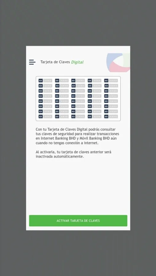 Con tu Tarjeta de Claves Digital podrás consultar tus claves de seguridad para realizar transacciones en Internet Banking BHD León y Móvil Banking BHD León Personal y Empresarial de forma fácil y segura. Esta aplicación es una alternativa digital a tu Tarjeta de Claves física actual. Al momento de activarla, está será tu única tarjeta de claves válida.