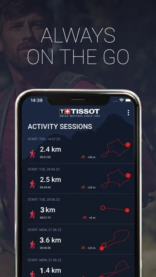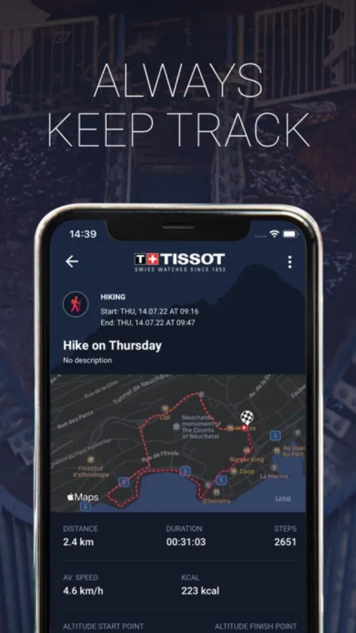 Access your health data registered while wearing your watch, such as number of steps, distance traveled, as well as burned calories. Define your daily activity goal within the app and follow your progression. The number of steps taken can now be shared with the Apple Health app.