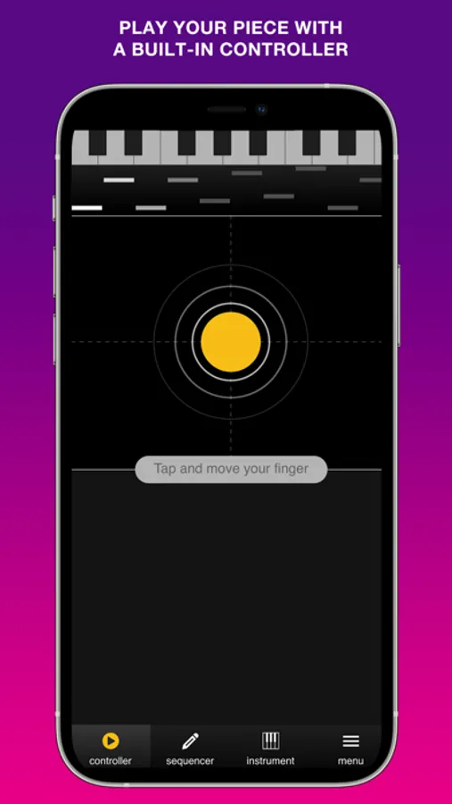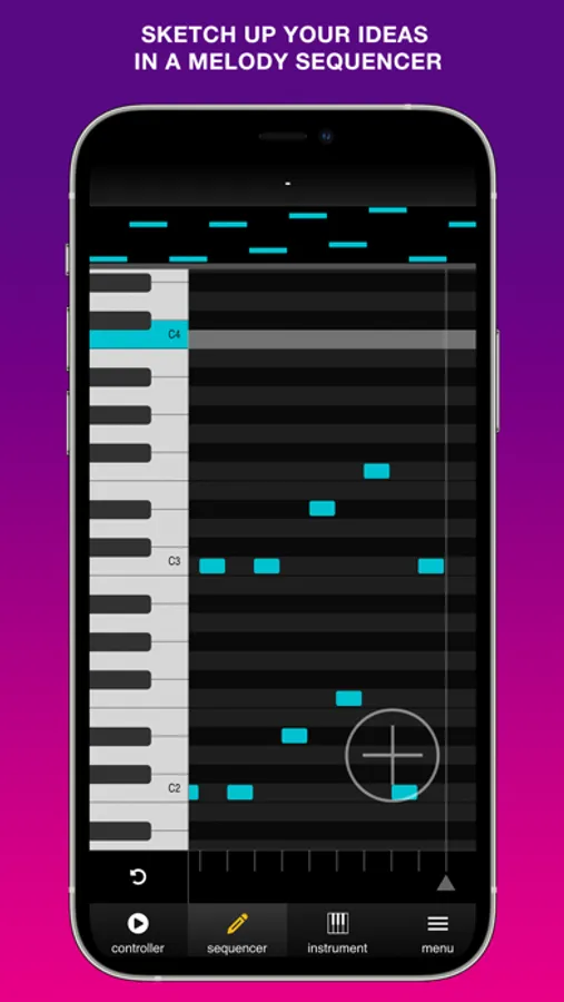 A built-in sequencer is implemented in the form of a traditional piano roll editor with a specific system for entering musical text using the thumbs of both hands. This approach allows you to hold the device comfortably, which allows the user to quickly record sequences.
