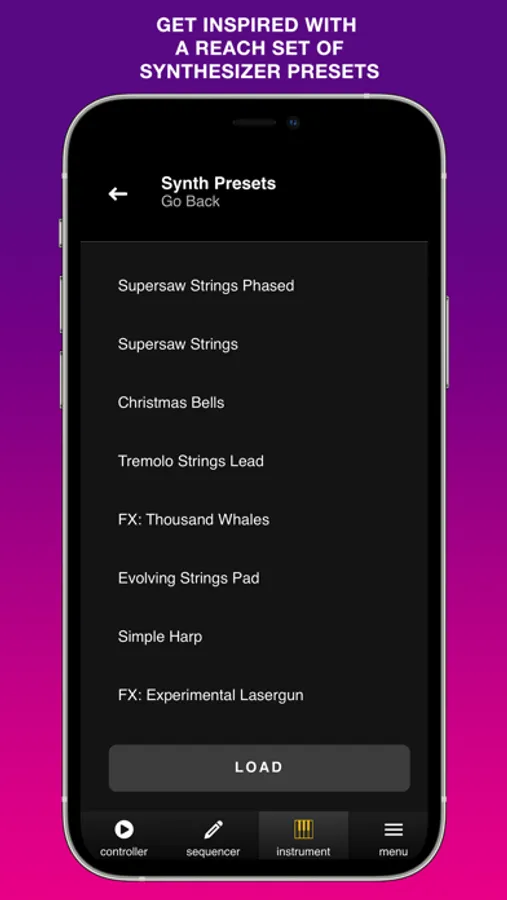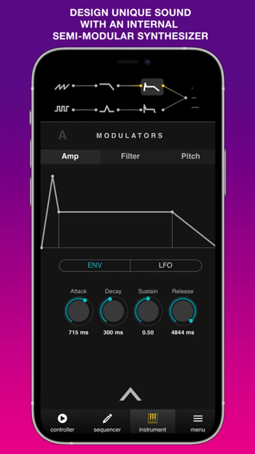 Semi-modular synthesizer with a straightforward graphical interface contains state variable filters, customizable oscillators, and modulators (envelopes and LFOs). The effects rack consists of stereo reverb, tape delay, and phaser. Any parameter of the app sound engine could be manually mapped to the app controller touch or motion events (finger position on screen and device rotation in space).