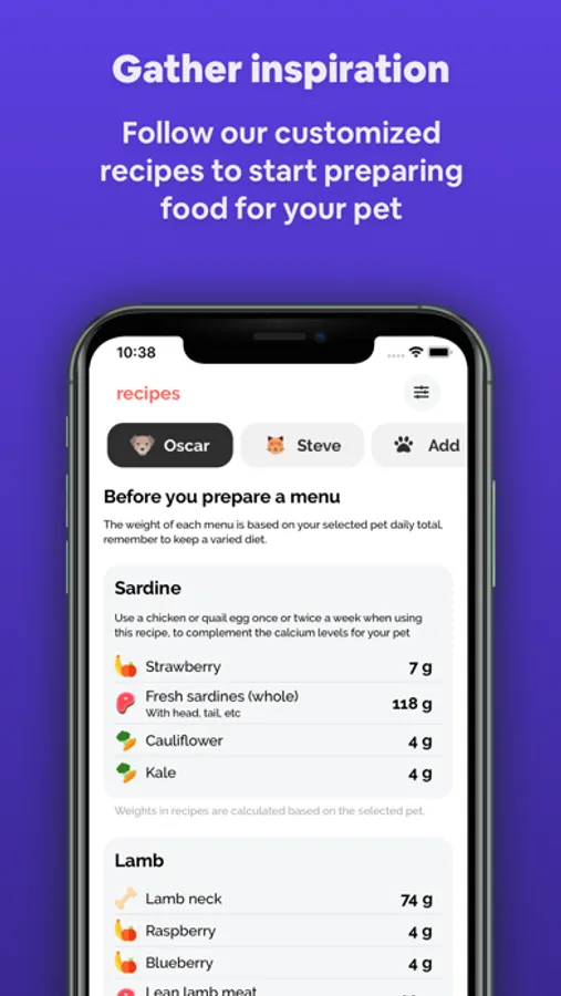 Use the food portions calculator, which takes your pet details and provides you with the correct portion sizes per meal and per day. Chomp will automatically show you what the recommended amount to feed is, adjusting itself depending on your pet age, activity, and other factors.