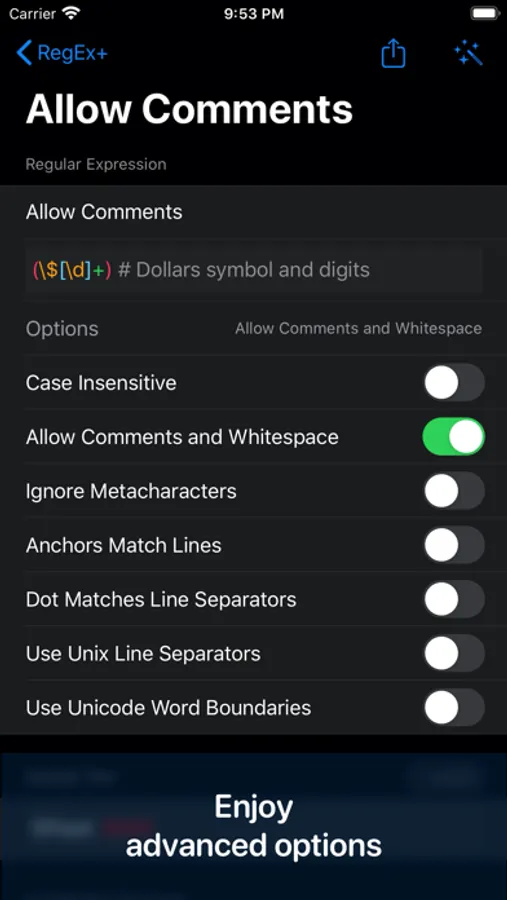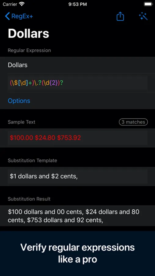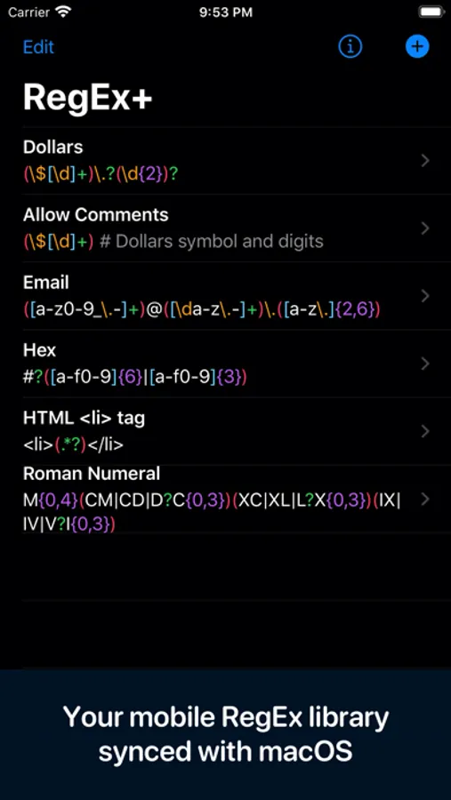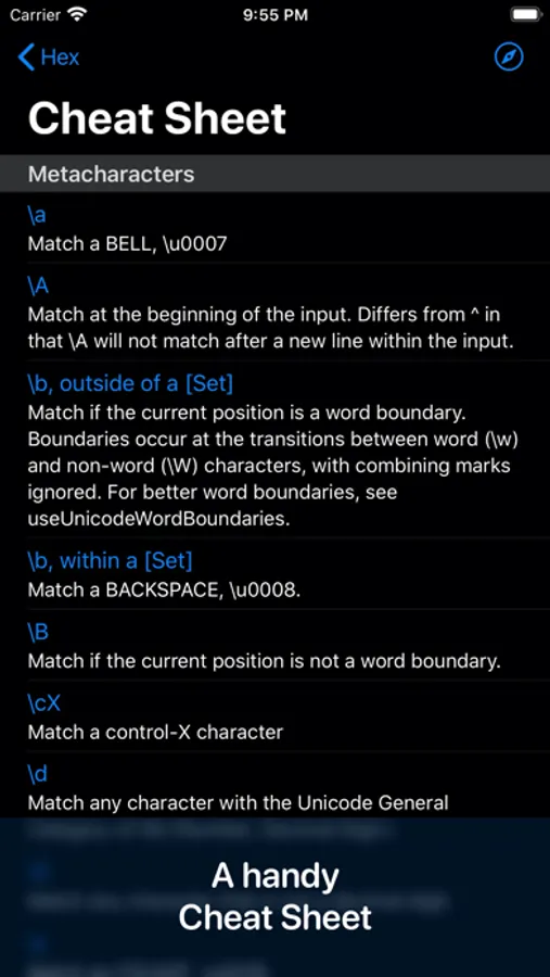 A nifty develop tool for the regular expression, for both macOS and iOS. Your data are synced through your devices with CloudKit. There's also a cheat sheet that helps you to get a better understanding of metacharacters and operators of the regular expression.