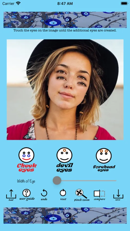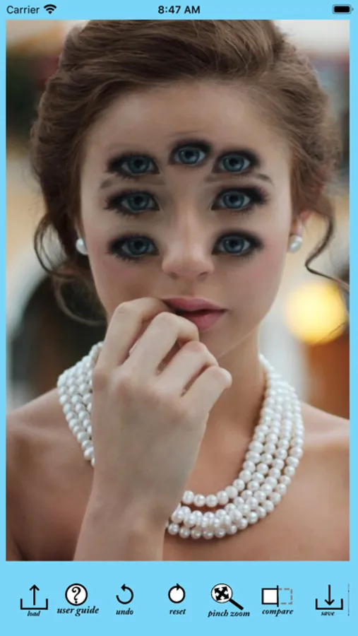 By using this app, you can develop photos with multiple eyes on your face similar to those on the screenshots.