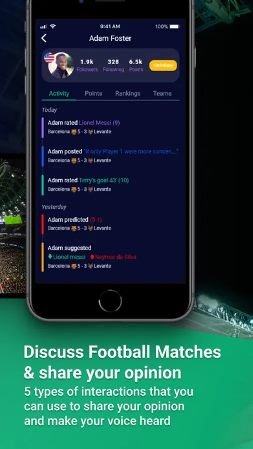 • Gain points by interacting with the football community, discussing football matches, rating players, rating goals, and whatever else tickles your fancy in the football arena!