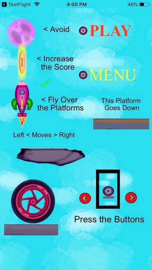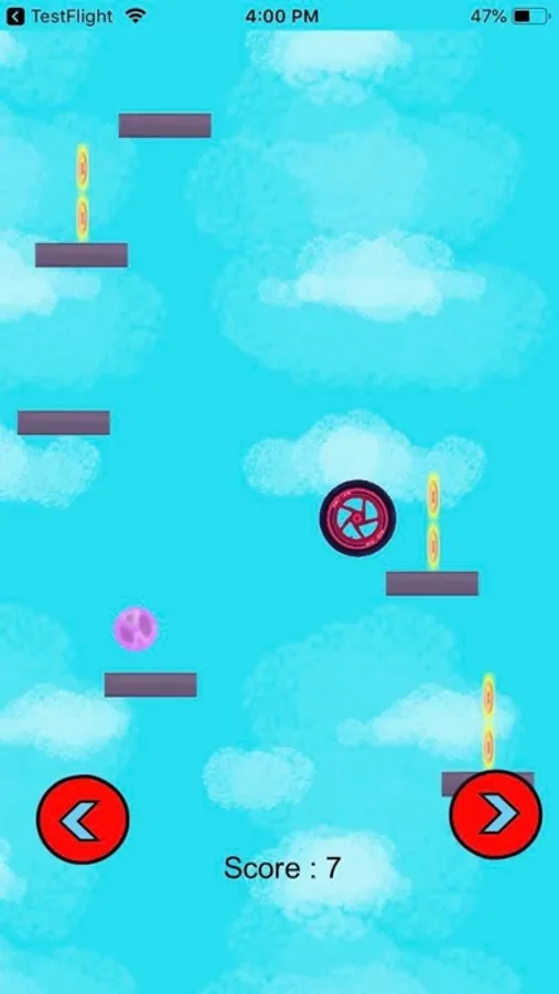 In Crazy Tire, the aim is to guide a rotating Tire up a never-ending series of platforms without falling and collecting as many coins as possible. The right side of the playing field is connected with the left side. Players have to press the red buttons to move the Tire in the desired direction. Users can get a short boost from a few objects, such as rockets and springs. The Tire must avoid the purple saws.
