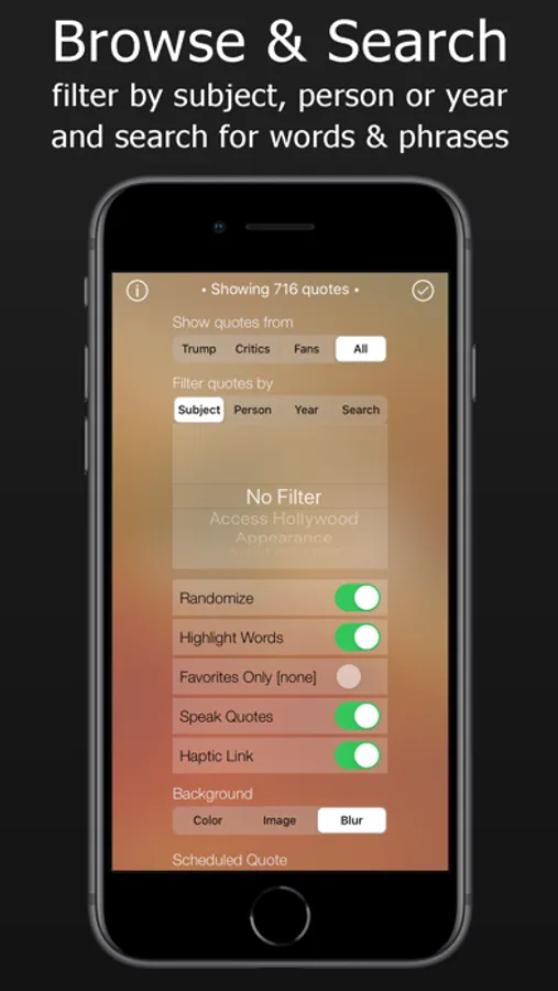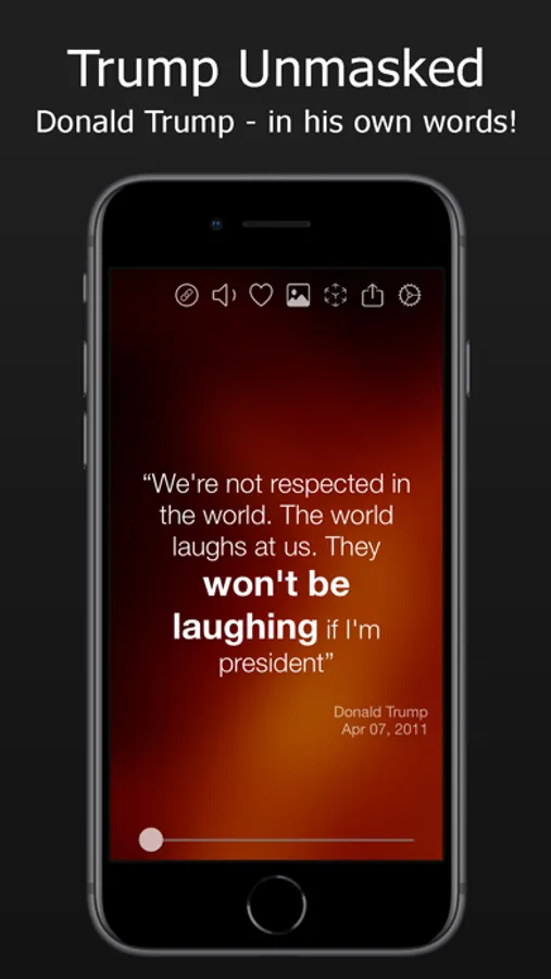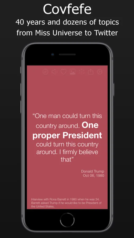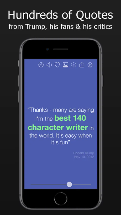 Here, presented in a fun and attractive interface, are several hundred of Donald Trump's most memorable and controversial comments from interviews, press conferences, articles, books, investigations and, of course, tweets. Tap and swipe your way through the quotes and save your favorites. Quotes can be filtered by subject or by year, or searched by keyword.