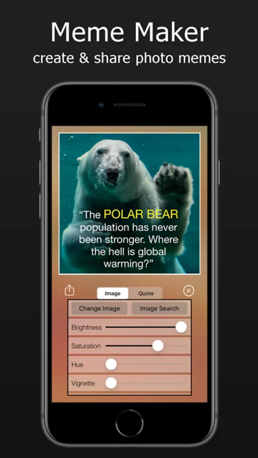 Download photos (or use your own) and overlay any quote to create and customize your own internet photo memes. Apply color effects and textures, and change text properties to create unique, personalized and evocative images. Then easily share them on social media.